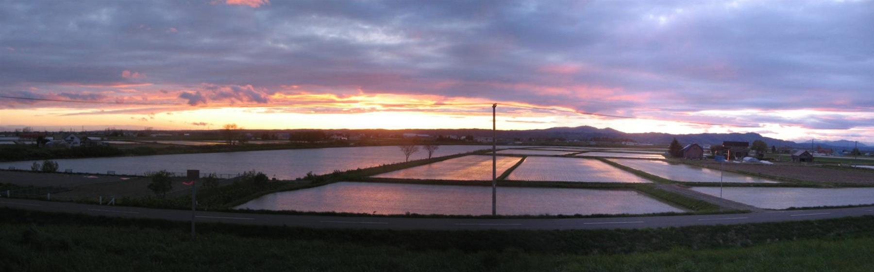 夕暮れのたんぼに映る色
