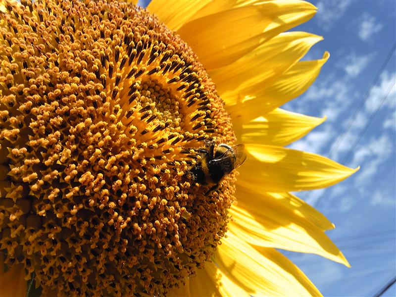 大きなヒマワリにしがみ付いてハチが一生懸命に蜜を吸ってますね