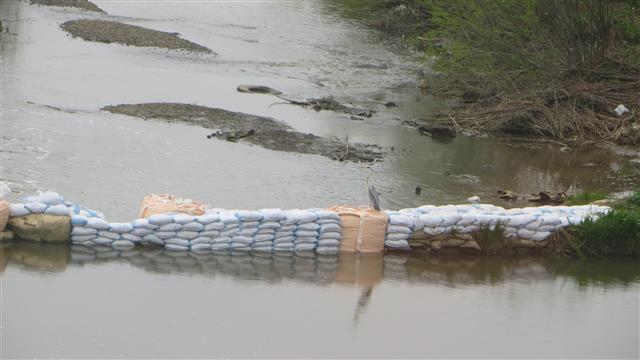 川の中のフレコン袋の上に